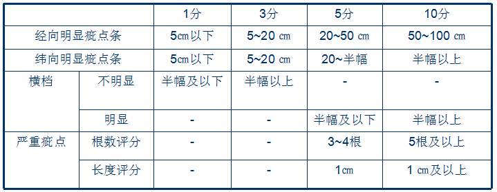 ●外觀質(zhì)量檢驗(yàn)根據(jù):染色不勻、染色條花、橫檔、跳花、油污等疵點(diǎn)情況,結(jié)合評分標(biāo)準(zhǔn)評分,由評分?jǐn)?shù)評等。