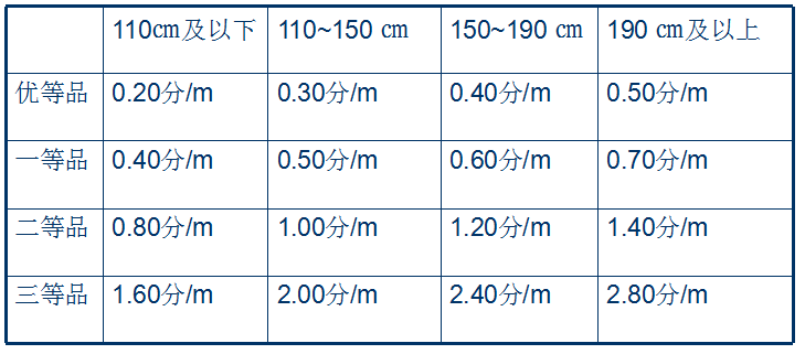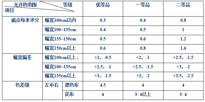 ●內(nèi)在質(zhì)量和外觀質(zhì)量分別評等后,以最低的品等作為該匹布等級。
