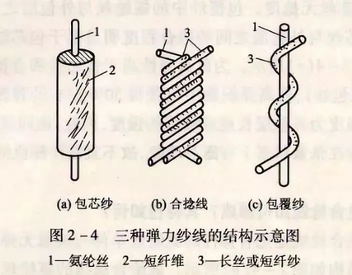 氨綸彈力纖維與其他纖維混合紡成彈力紗,其紗線的形式目前有三種形式:即氨綸包芯紗、氨綸合捻紗和氨綸包覆紗。三種形式的紗線在加工原理、結構性能上有著本質的區(qū)別。因此其用途和織造性能也有很大的差別。三種紗線的結構示意圖如圖所示。
