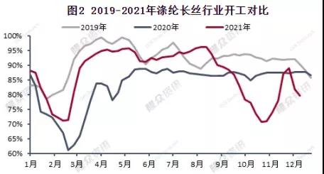 11月月底國內(nèi)部分生產(chǎn)企業(yè)減產(chǎn)保價,滌綸長絲行業(yè)開工降至8成以下,期間江蘇、福建兩地前期減停裝置陸續(xù)重啟,行業(yè)開工小幅提升,近日部分廠商裝置減產(chǎn),滌綸長絲行業(yè)開工率再度下降,整體開機(jī)率在8成以下,而目前冬季訂單已告罄,春季訂單稀少,一方面海外疫情并未有效控制,海運(yùn)費(fèi)居高不下,另一方面國內(nèi)多地疫情反復(fù),導(dǎo)致行業(yè)人士信心不足,滌綸長絲目前行業(yè)開工已處于同期相對較低的水平,然織造整體開工在6成以下,供需矛盾下滌綸長絲開工仍有下降的預(yù)期。綜上,多重利空拖累下,滌綸長絲供需將出現(xiàn)雙降的局面。