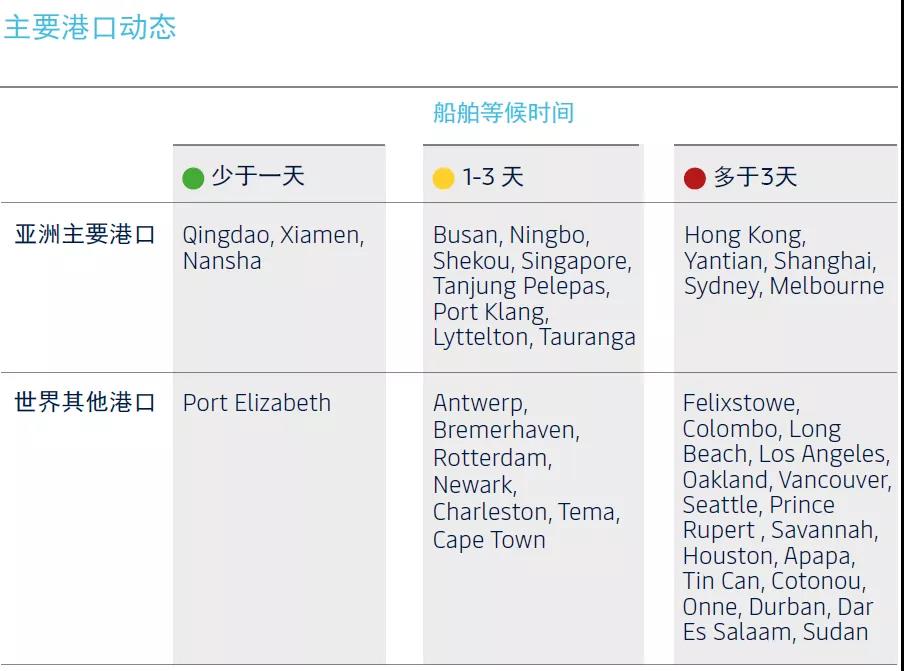 根據(jù)馬士基最新的亞太區(qū)供應鏈市場趨勢報告(2021年11月),全球主要港口動態(tài)如下表: