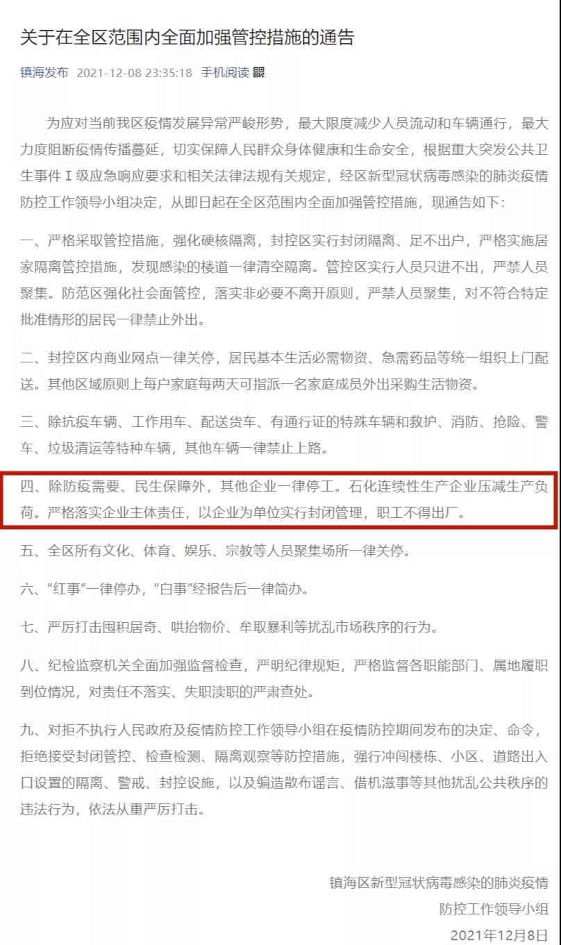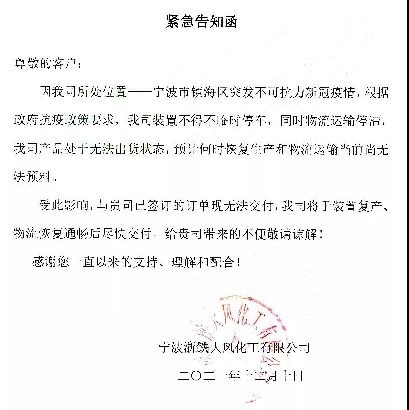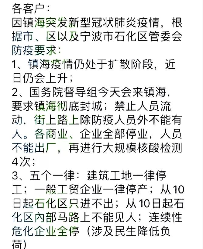 除此之外,江蘇宇星顏料、江蘇三木集團(tuán)、華祥(中國)高纖有限公司、榮盛集團(tuán)等當(dāng)?shù)仄髽I(yè)均提示客戶,由于當(dāng)?shù)匾咔榉忾],來提貨或送貨的運(yùn)輸人員,須持有24/48小時(shí)內(nèi)核酸檢測陰性報(bào)告,并注意選擇特定高速口進(jìn)出,健康碼為紅碼、黃碼的司機(jī)及外來人員一律不準(zhǔn)進(jìn)入。