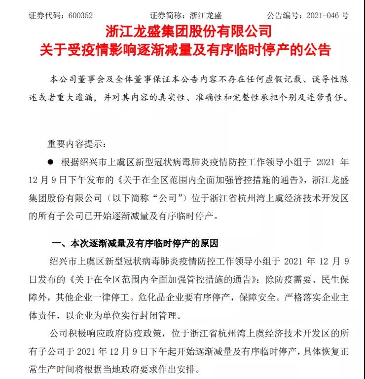 浙江龍盛:受疫情影響,公司位于浙江省杭州灣上虞經(jīng)濟(jì)技術(shù)開發(fā)區(qū)的所有子公司已開始逐漸減量及有序臨時(shí)停產(chǎn)。上述子公司主要目前主要生產(chǎn)染料、化工中間體、減水劑等化工產(chǎn)品,預(yù)計(jì)此次臨時(shí)停產(chǎn)將延遲公司相關(guān)產(chǎn)品的生產(chǎn)和交付,會對公司本月經(jīng)營業(yè)績產(chǎn)生不利影響。