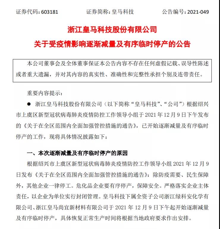 多個(gè)地區(qū)緊急叫停全區(qū)所有工業(yè)企業(yè),對于石化、?;瘜ζ髽I(yè)的開工做出限制,隨后浙江龍盛、皇馬科技、貝斯美等十幾家上市公司發(fā)布臨時(shí)停產(chǎn)公告,并預(yù)計(jì)將給企業(yè)的經(jīng)營業(yè)績帶來不利影響。
