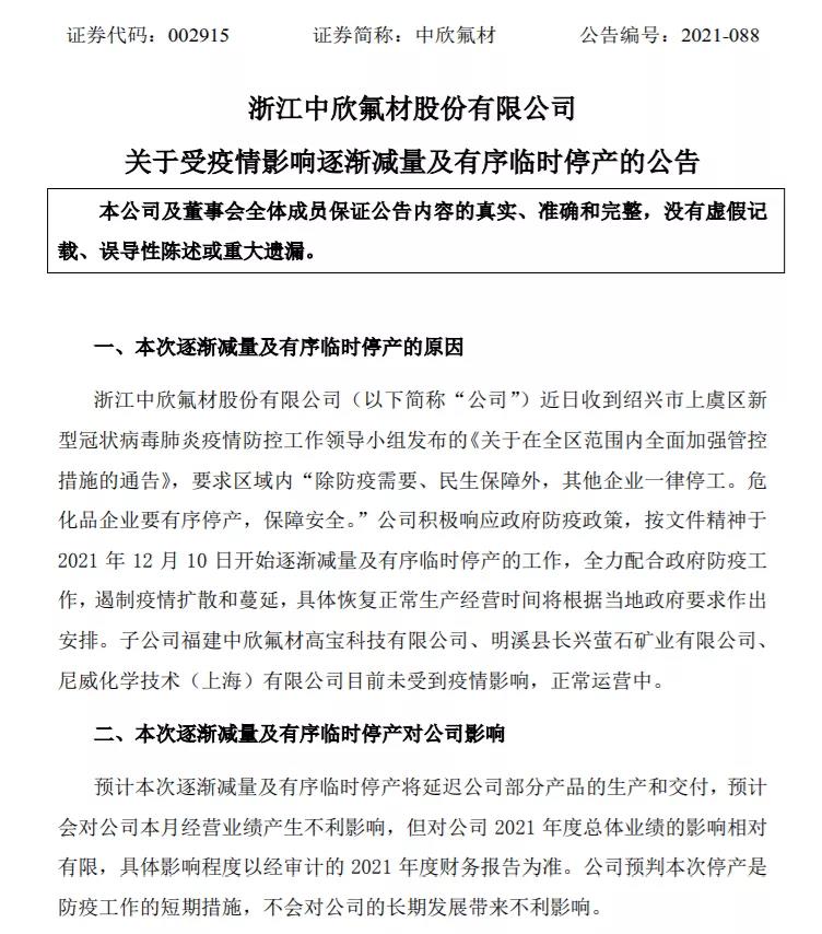 中欣氟材:于2021年12月10日開始逐漸減量及有序臨時(shí)停產(chǎn),具體恢復(fù)正常生產(chǎn)經(jīng)營時(shí)間將根據(jù)當(dāng)?shù)卣笞鞒霭才拧?/span>
