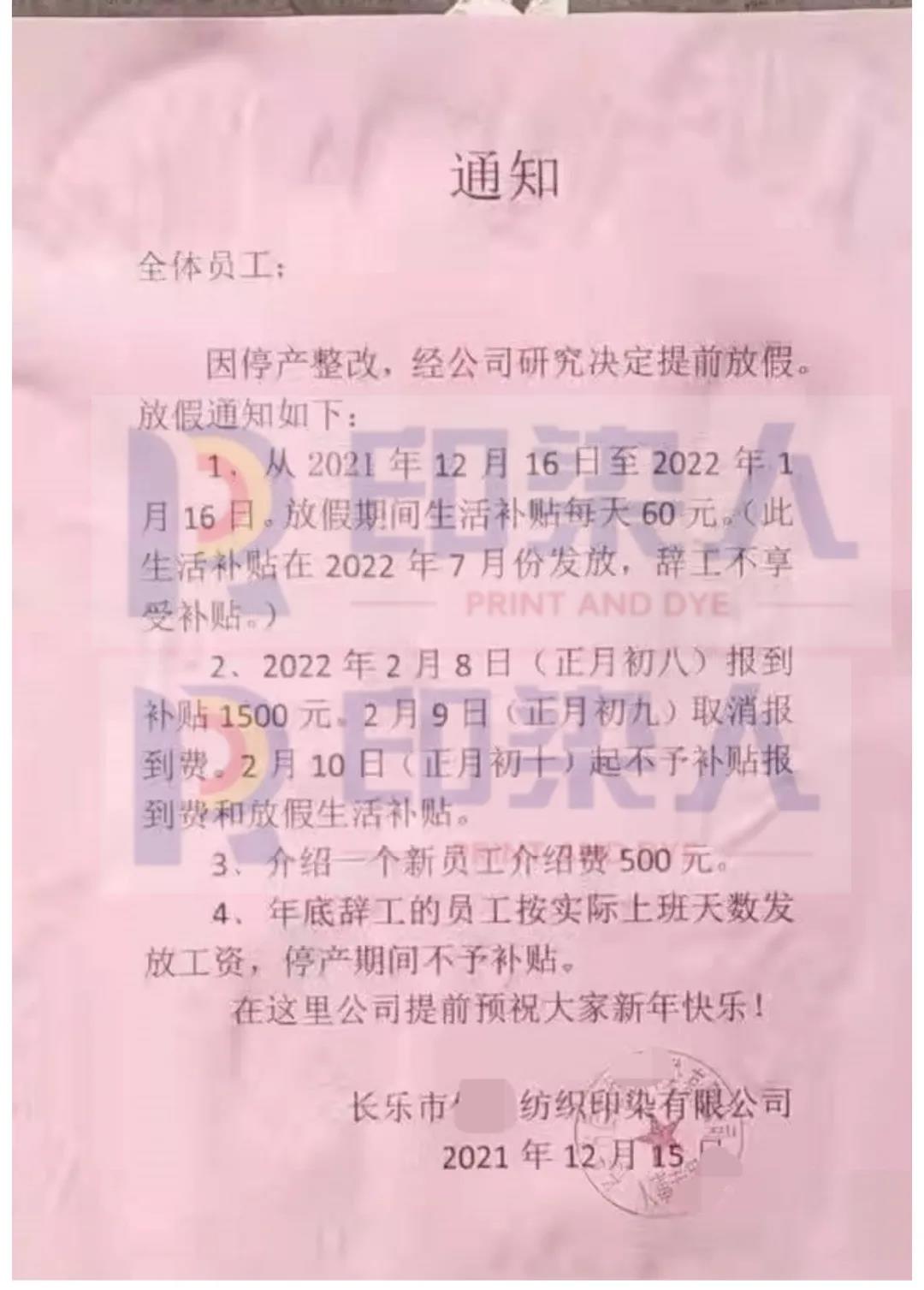 印染人從渠道獲悉,福建長樂某印染廠因停產原因,自12月16日開始放假,2022年2月8日員工報道,并對放假期間補助進行詳細說明。