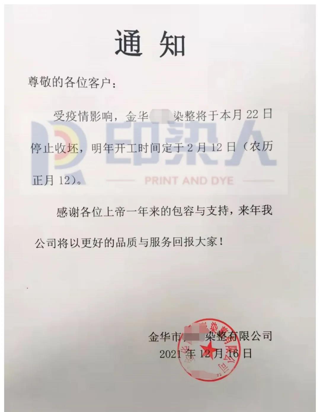 12月16日,浙江金華某染整公司發(fā)出通知,自12月22日停止收胚,明年開工時候定于2022年2月12日。