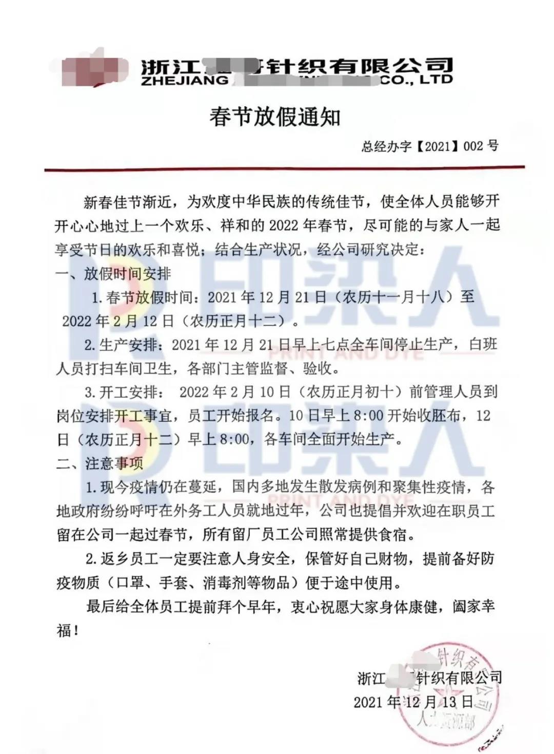 12月15日,廣東中山某染整處理公司發(fā)布2022年元旦、春節(jié)放假通知,其中春節(jié)放假時間自2022年1月17日至2月16日。