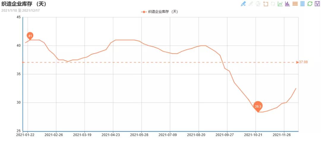 另一方面,近期由于浙江疫情及年底需求較差,市場傳言今年紡織廠的放假時間可能會出現提前的情況。目前織造廠家的庫存正處于上升階段,據綢都網數據監(jiān)測顯示,目前織造廠家的庫存在32.5天左右,較11月上升4天。另外江浙多地紡織廠及貿易商反饋,近一周多來常規(guī)坯布詢價和出貨仍沒有多大起色,成交價明顯回落,部分廠家調整幅度超過20%。同時原料價格也以小幅陰跌為主。