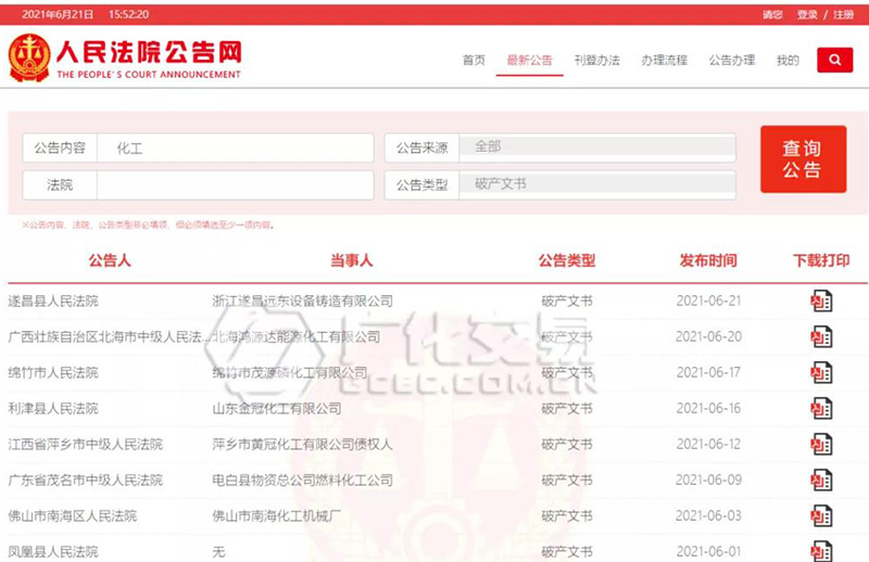 據(jù)人民法院公告網(wǎng)顯示,2020年至今,破產(chǎn)化企超過(guò)300家。