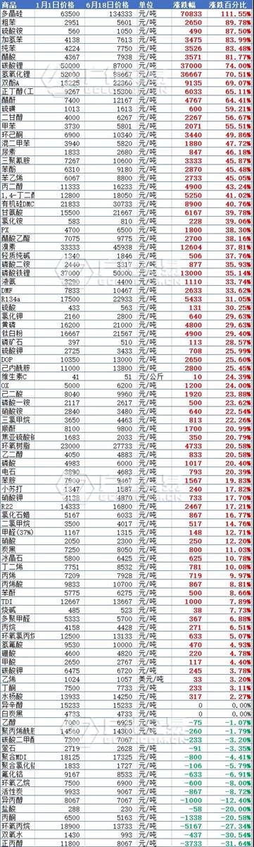 可以看到,盡管二季度化工產(chǎn)品價(jià)格有所回落,但整體來(lái)看,化工品今年仍有較大的漲幅。