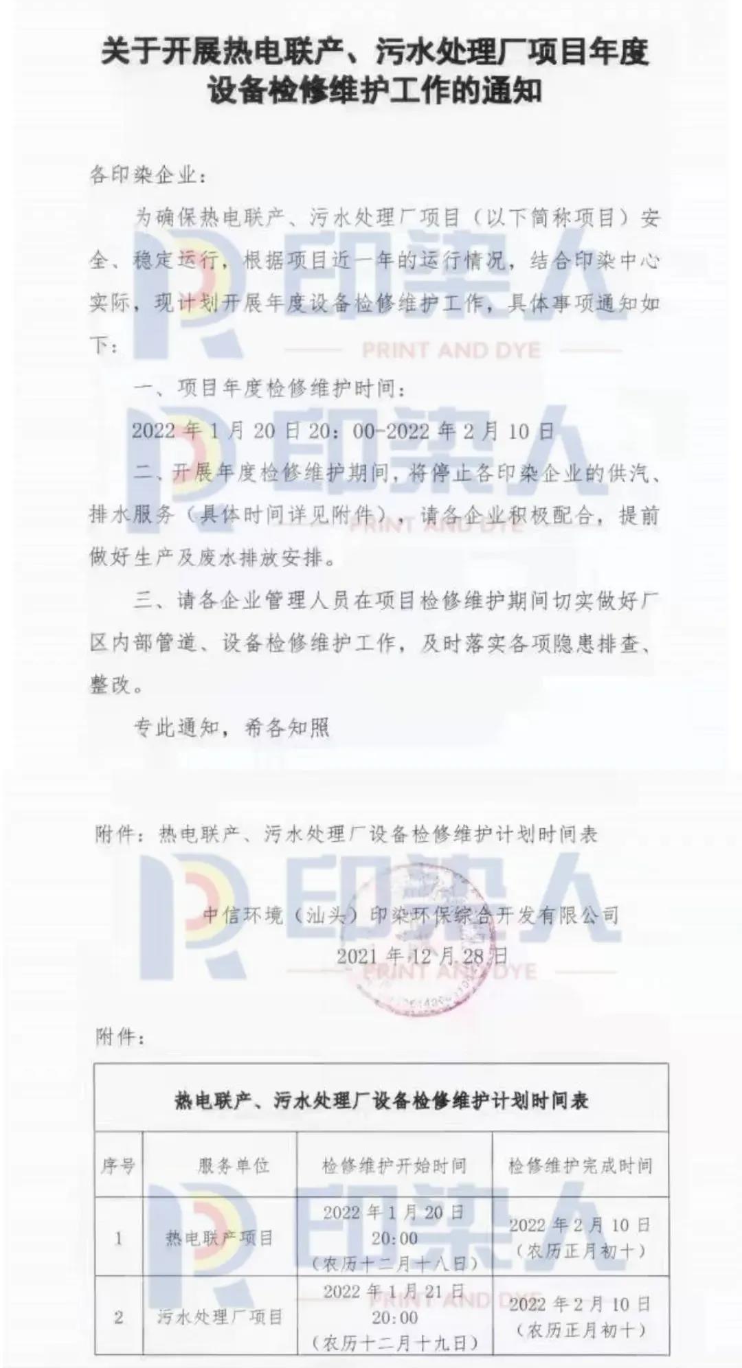 近日,中信環(huán)境(汕頭)印染環(huán)保發(fā)布《關(guān)于開展熱電聯(lián)產(chǎn)、污水處理廠項目年度設(shè)備檢修維護工作的通知》,告知園區(qū)各印染企業(yè),將于2022年 1月 20日 20:00開始項目年度檢修維護工作。
