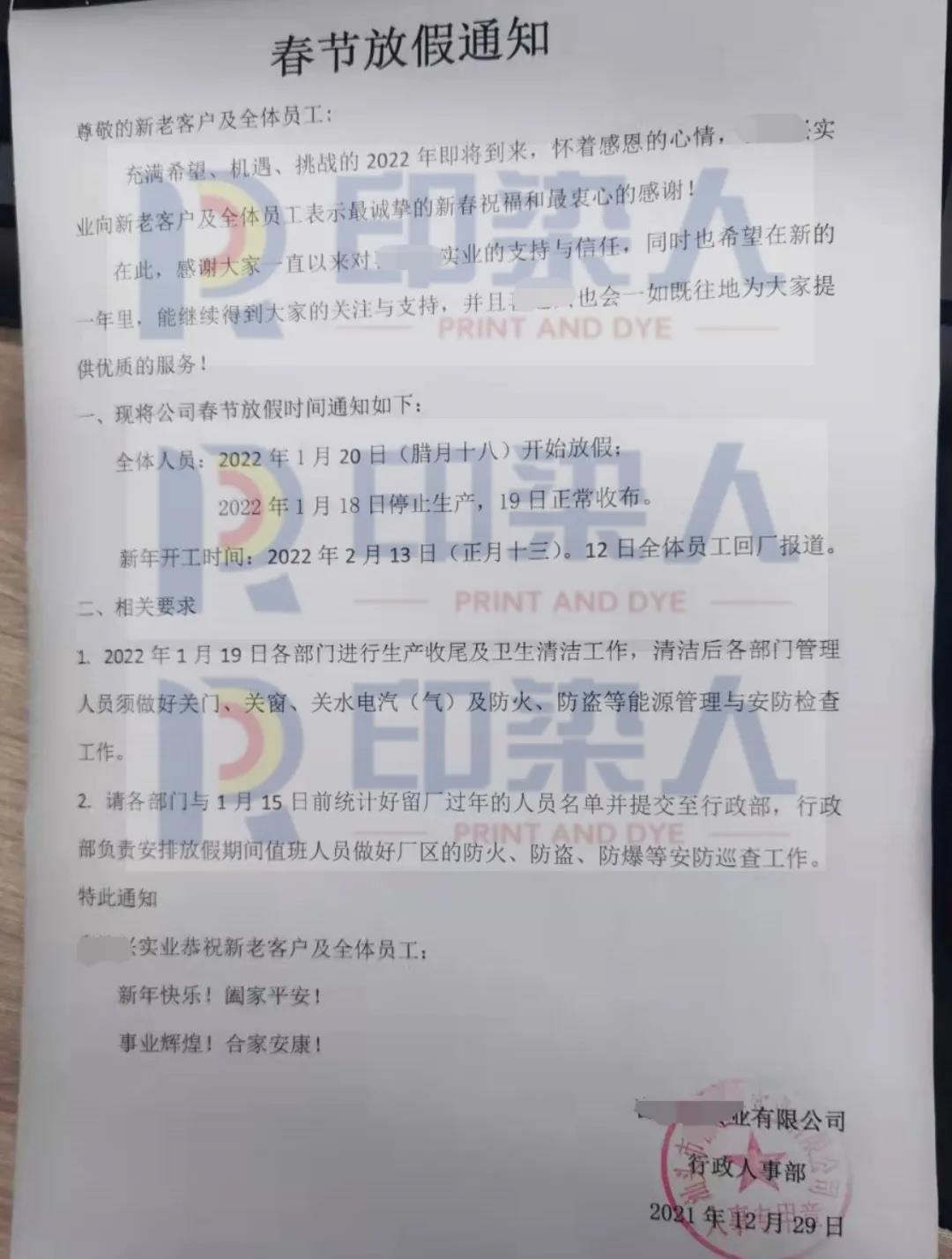 與此同時,潮南印染產(chǎn)業(yè)園有印染企業(yè)發(fā)出《春節(jié)放假通知》,具體時間為:2022年 1月 20日開始放假,2022年 2月12日全體員工回廠報道。并對放假期間的工作進行了安排。
