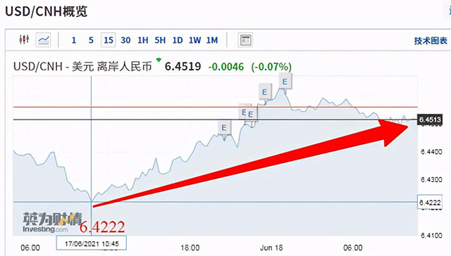 6月以來(lái),在岸人民幣匯率累計(jì)下跌633個(gè)基點(diǎn),跌幅達(dá)0.99%;離岸人民幣匯率累計(jì)下跌近600點(diǎn),跌幅達(dá)到0.93%。6月18日,人民幣對(duì)美元匯率中間價(jià)報(bào)6.4361,較前一交易日下調(diào)63個(gè)基點(diǎn)。