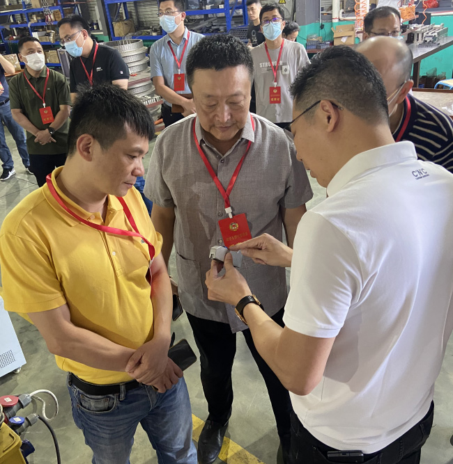 公司負(fù)責(zé)人正在向市領(lǐng)導(dǎo)講解發(fā)往歐美客戶定制特殊結(jié)構(gòu)的部件。