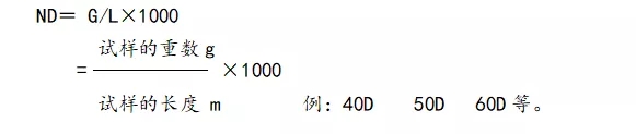 旦尼爾(Denter)制:(一般表示長(zhǎng)絲)在公定回潮率時(shí),以9000m長(zhǎng)度的重量克數(shù)來(lái)表示算稱(chēng)旦數(shù),用ND表示: