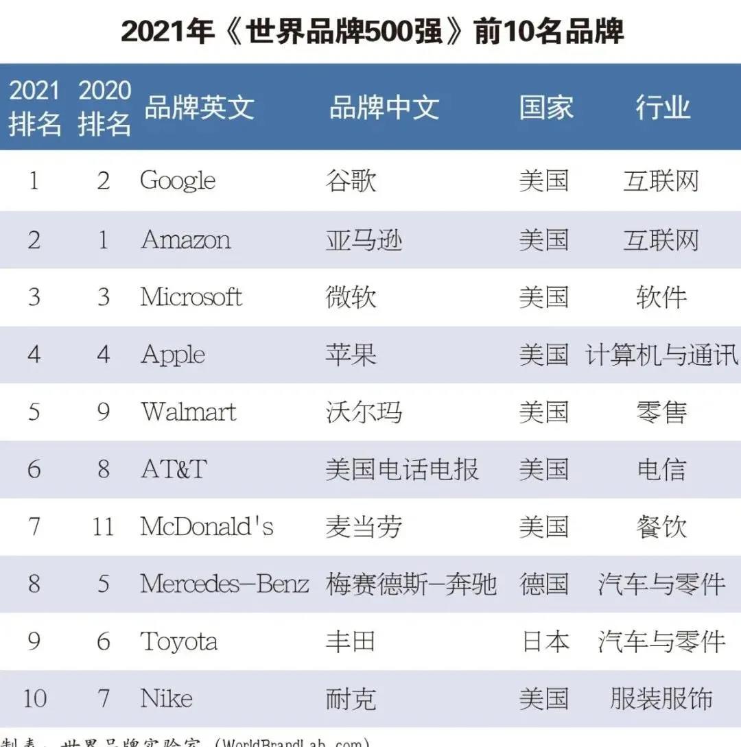 憑借優(yōu)異的市場表現(xiàn)及強勁的業(yè)務增長,去年的亞軍谷歌(Google)一舉擊敗亞馬遜(Amazon)榮登榜首;亞馬遜因受疫情影響業(yè)績不及預期,退居第二;2021財年凈利潤大增的微軟(Microsoft)繼續(xù)保持第三。美國占據(jù)500強中的198席,穩(wěn)居品牌大國第一。法國、日本、中國和英國為世界品牌大國的第二陣營。中國品牌入選數(shù)(44個)超越英國(37個),繼續(xù)保持第四名的好成績。
