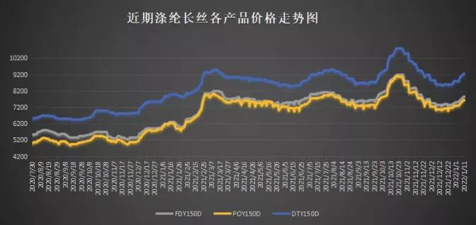目前上游滌絲價(jià)格在1月份以來出現(xiàn)了明顯的一波上漲并持續(xù)至今。在國際油價(jià)上漲的帶動下,聚酯原料PTA、滌綸長絲價(jià)格持續(xù)走高。滌綸長絲已經(jīng)持續(xù)13連漲,POY150D從6975元/噸漲至7780元/噸,漲幅達(dá)11.54%;DTY150D從8550元/噸上漲至9350元/噸,漲幅為9.36%;FDY150D從7200元/噸上漲至8000元/噸,漲幅為11.11%。