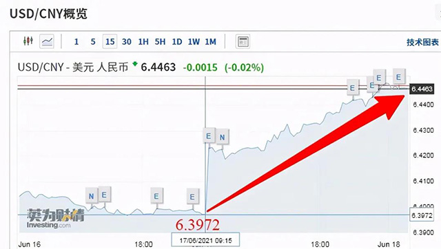 6月以來(lái),在岸人民幣匯率累計(jì)下跌633個(gè)基點(diǎn),跌幅達(dá)0.99%;離岸人民幣匯率累計(jì)下跌近600點(diǎn),跌幅達(dá)到0.93%。6月18日,人民幣對(duì)美元匯率中間價(jià)報(bào)6.4361,較前一交易日下調(diào)63個(gè)基點(diǎn)。