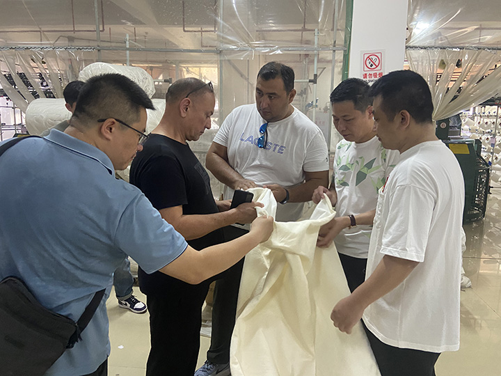 向客戶展示“漢馬”大圓機生產(chǎn)的樣布。