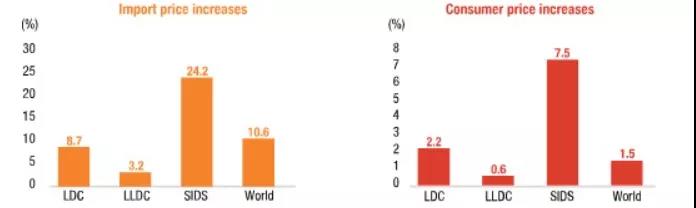 小島嶼發(fā)展中國(guó)家(SIDS)受到的影響最大,海運(yùn)成本飆升將令其消費(fèi)者價(jià)格上漲7.5個(gè)百分點(diǎn)。內(nèi)陸發(fā)展中國(guó)家(LLDC)消費(fèi)者價(jià)格可能上漲0.6%。