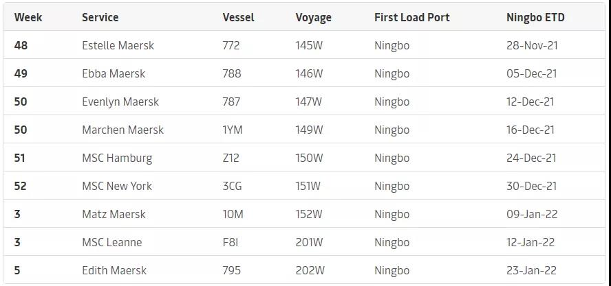從中國(guó)寧波港出發(fā)的AE7/Condor將省略Felixstowe的船名航次如下: