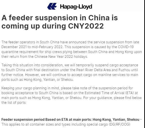繼23日ONE發(fā)布公告暫停接收經(jīng)華南地區(qū)主要港口再通過(guò)國(guó)內(nèi)支線到達(dá)最終目的地的貨物后,26日晚,赫伯羅特官網(wǎng)也發(fā)布公告,由于在2022年春節(jié)假期結(jié)束后,往返華南和香港的船員需要接受新冠肺炎檢疫。華南支線運(yùn)營(yíng)商已宣布從2021年12月底至2022年2月中旬暫停服務(wù)。