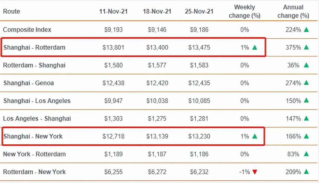 三是疫情期歐美、東盟等各國物流受阻,我國各港口集裝箱非常緊張,甚至“一箱難求”,近期海運費價格連續(xù)大幅上漲,德魯里指數(shù)顯示,上海-鹿特丹的運費上漲1%即75美元達到13475美元/FEU。同樣,上海至紐約的即期運費上漲1%至13230美元/FEU。然而,上海-熱那亞、上海-洛杉磯的運價徘徊在前幾周的水平附近。德魯里預(yù)計未來一周利率將保持穩(wěn)定。
