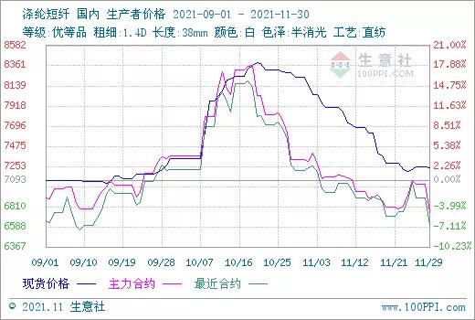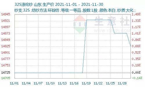 另據(jù)生意社價格監(jiān)測顯示,純滌紗市場報價穩(wěn)跌互現(xiàn),截止11月30日,山東地區(qū)32S滌綸紗現(xiàn)貨市場均價在14825元/噸左右,較上周下跌50元/噸,較月初價格(14725元/噸)上漲100元/噸。據(jù)一些市場人士反映,成交量相比前期沒有改觀,而貿(mào)易商家心態(tài)多已無力,純滌紗廠家?guī)齑胬^續(xù)增加,出貨心理較濃。