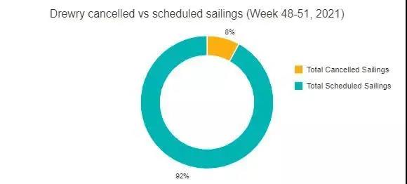 在跨太平洋、跨大西洋、亞洲-北歐和亞洲-地中海等主要航線總共556個預定航次中,在第48周至第51周之間取消了47個航次,取消率為8%。根據(jù)德魯里本期數(shù)據(jù),在此期間,72%的空白航行將發(fā)生在跨太平洋東向貿(mào)易航線中。