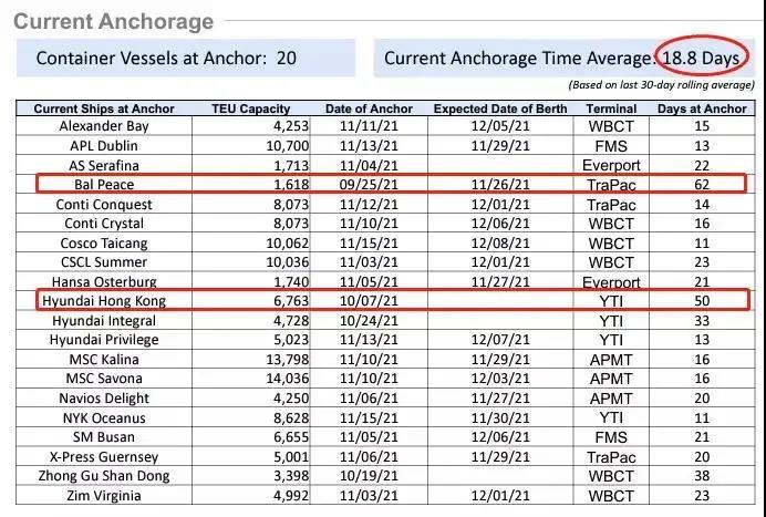 據(jù)洛杉磯港signal平臺11月26日的最新數(shù)據(jù)顯示,目前在洛杉磯港和長灘港外每艘船的平均等待靠泊的時間已達到18.8天,是兩個月前的兩倍多,這艘"Bal Peace"的集裝箱船等待靠泊已達62天,雖然新的船舶排隊系統(tǒng)算法表面上看等待的船只減少了,但是船舶實際等待的時間加長了,這無疑令這兩大港口外集裝箱船的擁堵情況愈發(fā)惡化。
