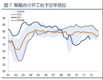 從分項(xiàng)來(lái)看,截至2021年12月2日,國(guó)內(nèi)滌綸長(zhǎng)絲開(kāi)工負(fù)荷77.11%,環(huán)比-6.19%;滌綸短纖開(kāi)工負(fù)荷67.02%,環(huán)比-1.31%;聚酯瓶片開(kāi)工負(fù)荷維持78.46%不變。整體開(kāi)工也處于近5年低位。